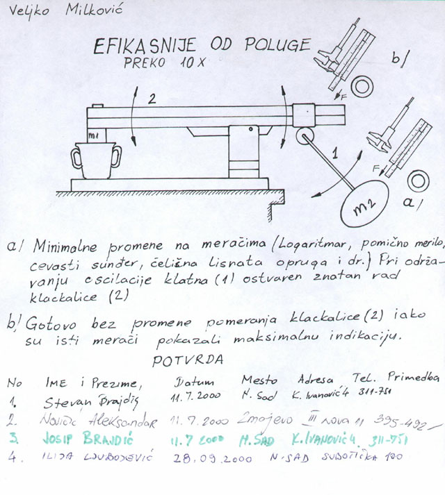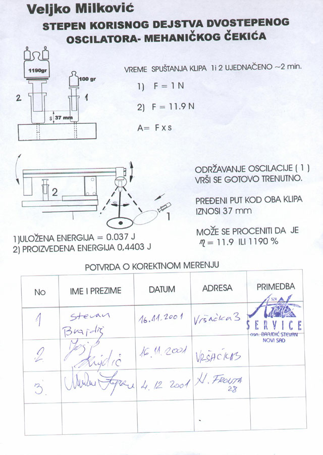 Tokom poslednjih godina Veljko Milković obavio je veći broj različitih merenja. Merenja su pokazala suficit, energetski, koji iznosi oko 12 puta više od uloga. To znači da se preko dvostepenih oscilacija dobija negde oko 12 puta ili 11,9 puta više od uloga.