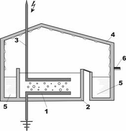 Slika 1. Energijom groma do čiste vode. 1 - uzemljena elektroda, 2 - izolovani bazen sa vodom za destilaciju, 3 - elektroda sa gromobranom, 4 - vodena para se kondezuje na zidovima objekta i sliva u kanal 5 sa destilovanom vodom, sigurnosni ventil 6 ograničava pritisak u postrojenju.