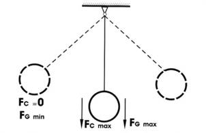 U gornjoj tačci klatno ima bestežinsko stanje ili smanjenje sila teže u jednom trenutku. Istovremeno, centrifugalna sila je ravna nuli.