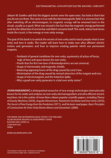 Jovan Marjanovic is distinguished researcher of new energy technologies internationally known for his works and analyses on over unity electromagnetism and ultra efficient electric machines. He is the author of more than a dozen popular scientific papers, including Theory of Gravity Machines (2010), Angular Momentum, Parametric Oscillator and Over Unity (2010), The Secret of Free Energy from the Pendulum (2011), and his best-read paper, Basic Principles of Construction for Over Unity Electro Motors and Generators (2009). more