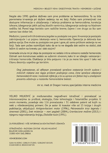 Iznenada sinula mi je ideja da postojeće wc sedalo iritira odnosno rasteže hemoroide. Odmah sam konstruisao sedalo sa suženim otvorom, kako bi se izbeglo rastezanje i iritiranje hemoroida. Olakšanje je bilo potpuno i to je za mene bio spas! I tako već čitavu deceniju uspešno ga koristim.