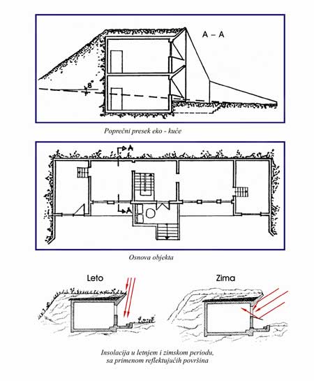 Ekološka kuća ima umesto klasičnog krova zemljanu zaštitu koja štiti objekat od niskih zimskih i letnjih visokih temperatura, a pored toga zidovi su zaštićeni od erozije. Eko kući nisu potrebni duboki temelji, velika ostava za ogrev, znatne grejne instalacije i dr.