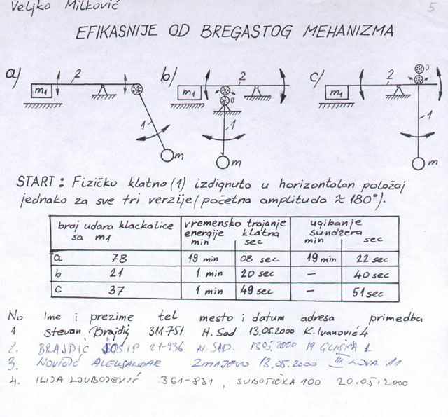 Takođe, obavljeno je i zvanično elektro merenje u saradnji sa Institutom za energetiku, elektroniku i telekomunikacije iz Novog Sada, gde su takođe, na isti način, korišćenje iste dinamo lampe (jednom dinamo lampom držanom u ruci odgurivalo se klatno u gornjoj tačci i na taj način se održavala oscilacija klatna, a druga, isto takva dinamo lampa je stavljena iznad poluge na izlaznom delu oscilatora) i dobijene su sledeće vrednosti: